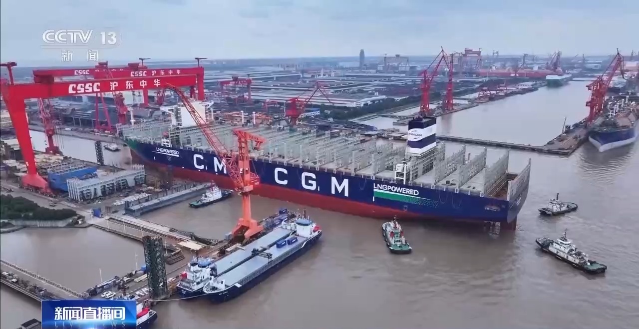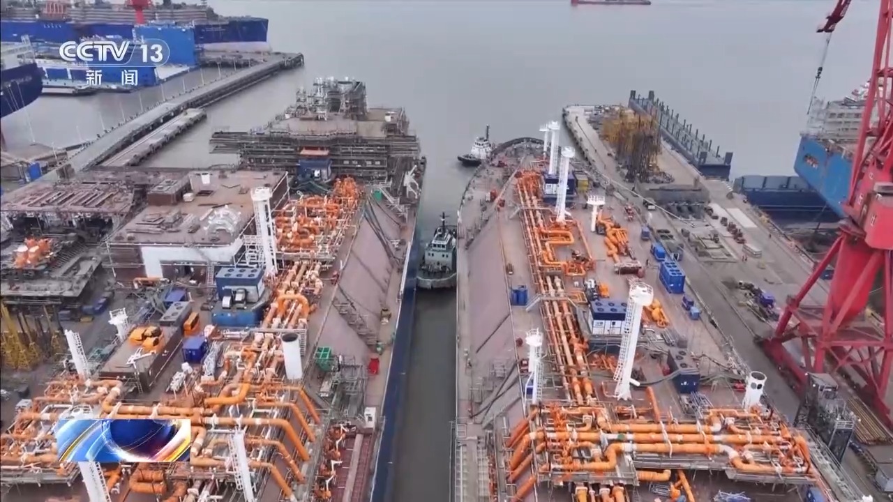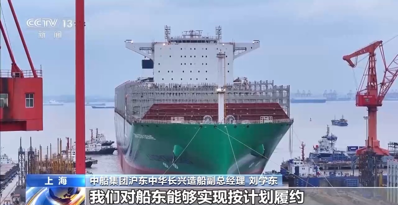 中船集团沪东中华长兴造船副总经理 刘学东:我们的建造中也通过技术工艺革新做了一些突破,从建造之初到出坞在码头上的周期,我们现在已经压缩到4到5个月了,对比原来的建造情况已经大幅提前,交船的话,这条船提前半年以上。这个周期的控制水平是处于造船行业的一流水准了。