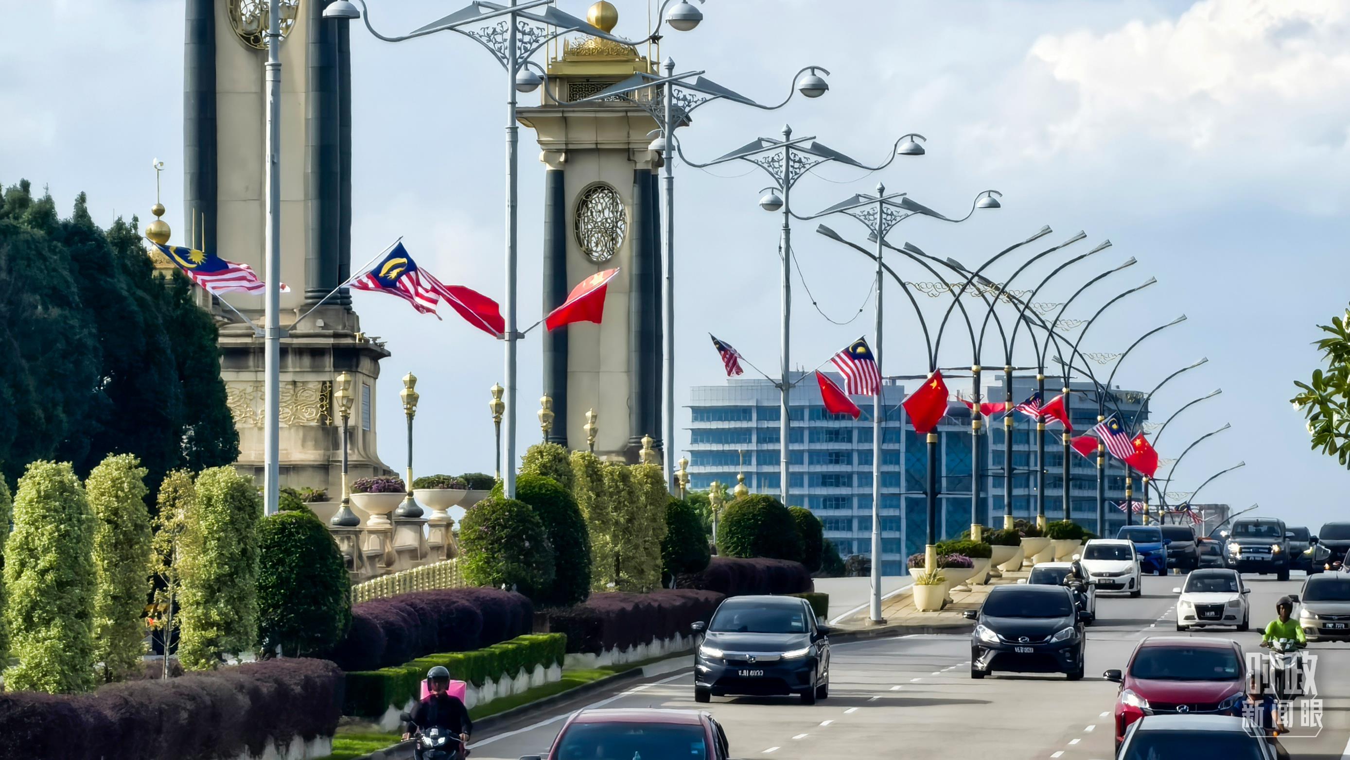 △布特拉加亚街头,中马两国国旗迎风飘扬。(总台央视记者刘岳拍摄)