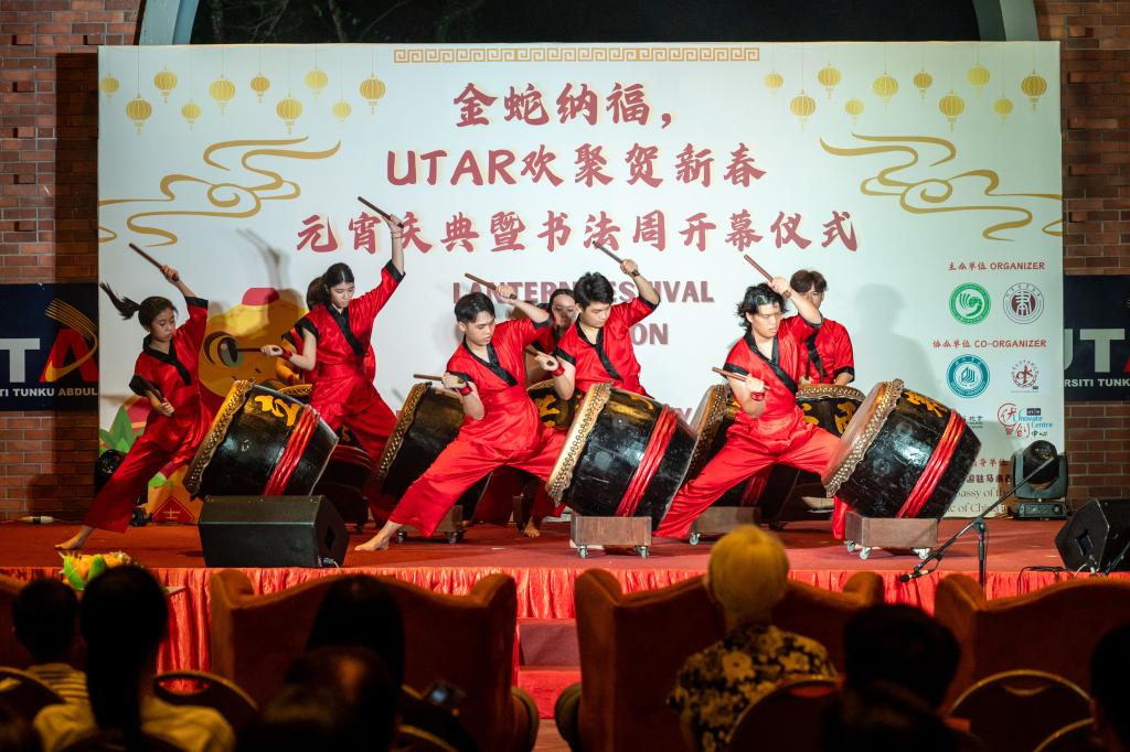 2月12日,学生们在马来西亚拉曼大学金宝校区表演二十四节令鼓。新华社发(张纹综摄)