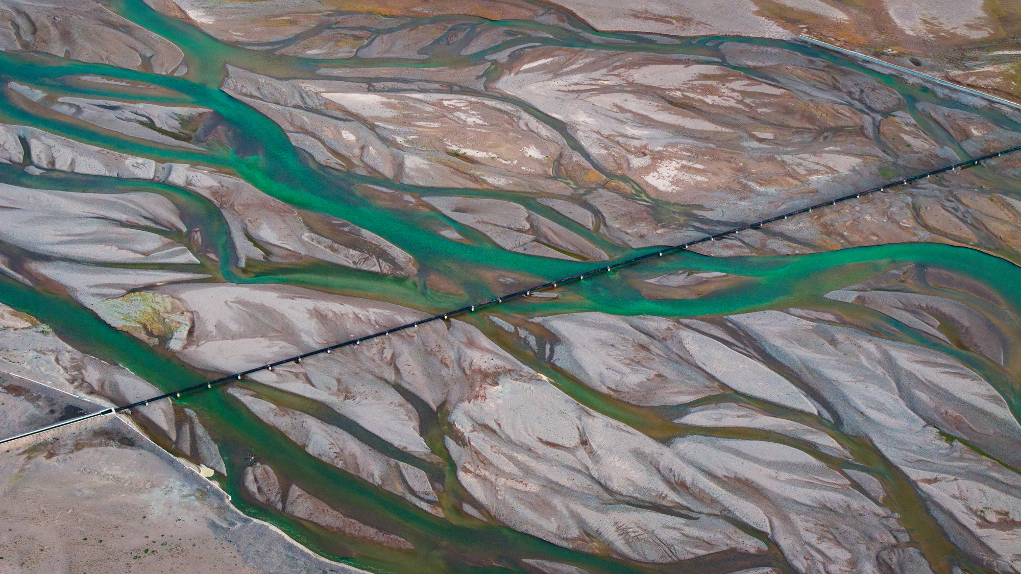 作品捕捉了森格藏布河的独特风貌。河流如灵动的绿色丝带,蜿蜒穿梭于广袤大地,与周边的沙地交织出宛如脉络般的奇妙图案,展现出大自然的鬼斧神工与勃勃生机。