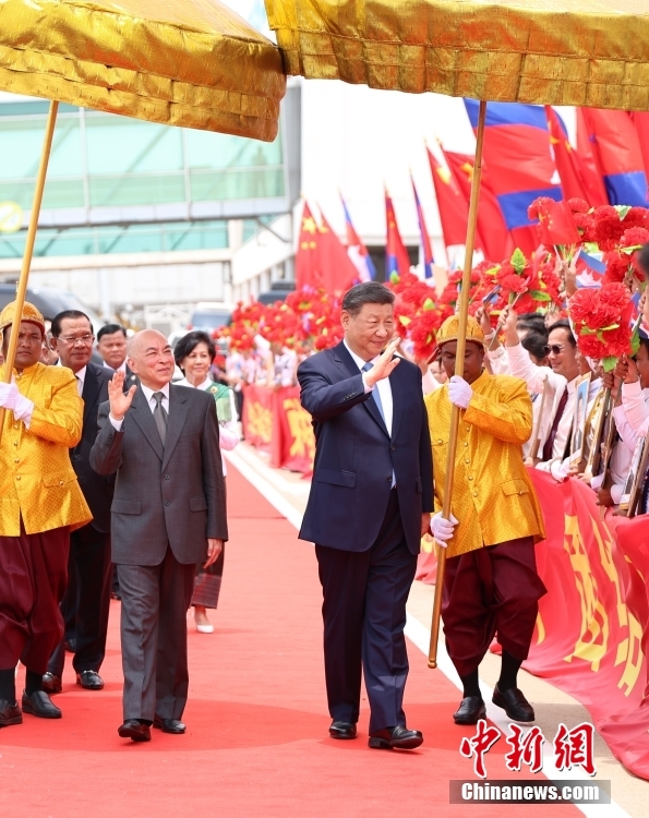 当地时间4月17日上午,中国国家主席习近平乘专机抵达金边,应柬埔寨国王西哈莫尼邀请,对柬埔寨进行国事访问。西哈莫尼在机场为习近平举行隆重欢迎仪式。 中新社记者 盛佳鹏 摄