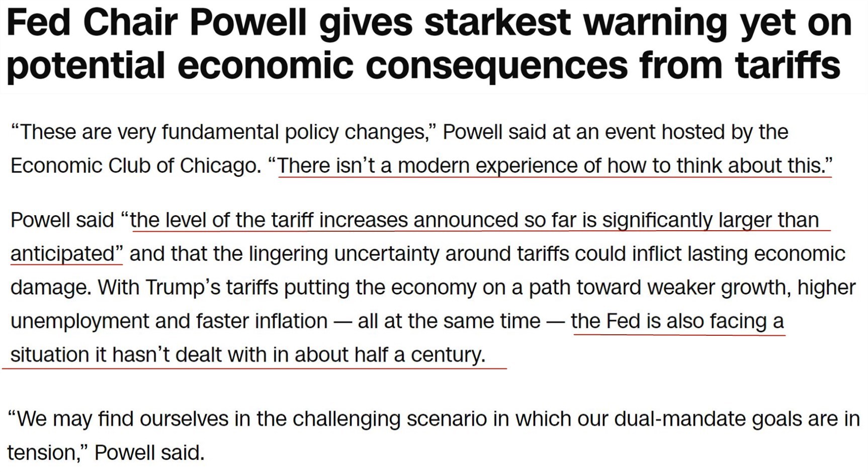 此前一天,鲍威尔在芝加哥经济俱乐部发表讲话时指出,美国政府已宣布的关税上调幅度远超预期水平,其带来的经济影响同样可能超出预期,令美联储货币政策制定面临更棘手的局面。