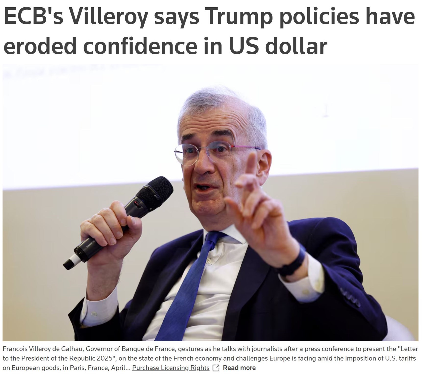 在维勒鲁瓦看来,特朗普政府的保护主义政策及其反复无常的贸易立场,正在动摇美元作为全球主要储备货币的信任基础,损害市场对美元的信心。