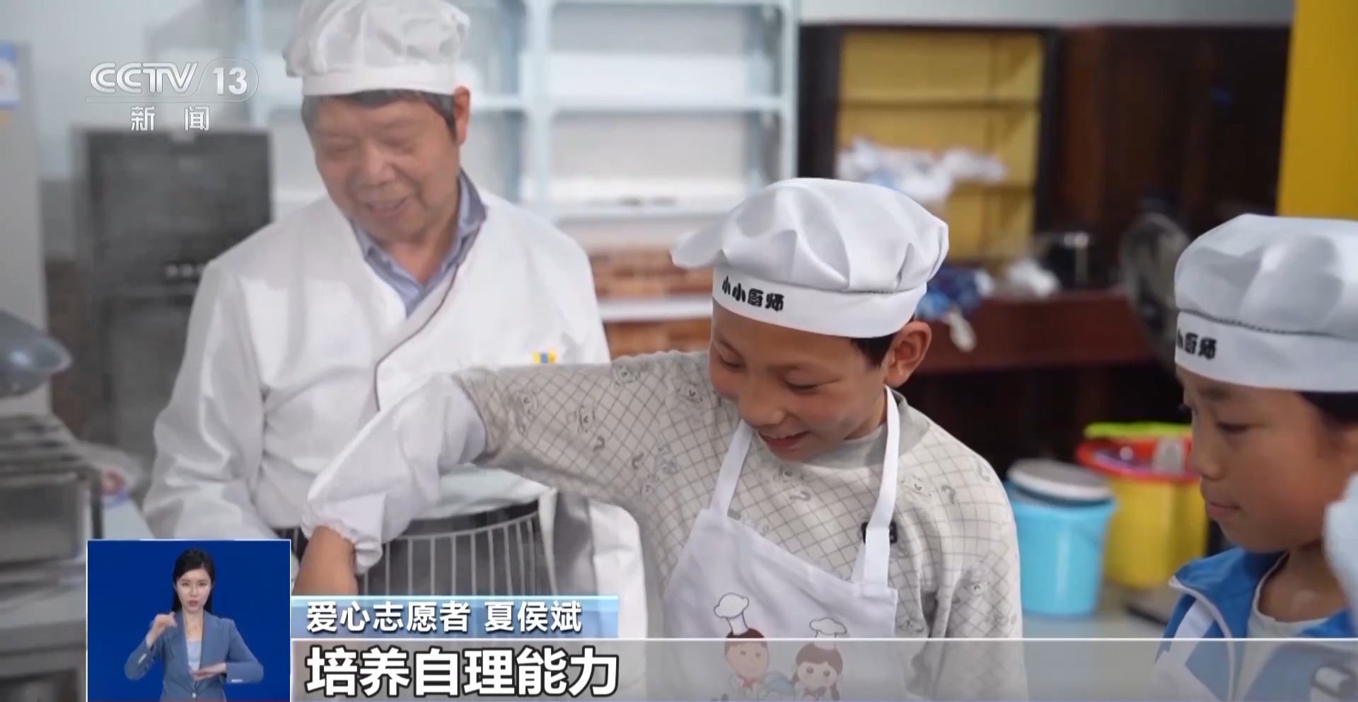 爱心志愿者 夏侯斌:主要是帮助孩子辅导作业,教他们书法,还有就是为了让孩子们动手能力更强,培养自理能力,还经常在这里教他们炒菜做饭,这些孩子我看着他们就很亲切,就把他当成自己的孩子。就是在这么一种动力下,才把志愿者做到现在。
