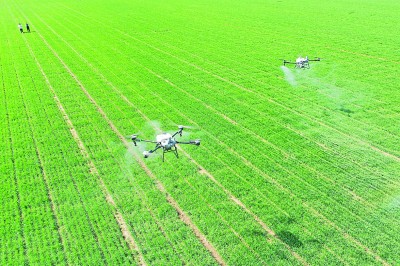 山东省青岛市即墨区段泊岚镇瓦戈庄村绿色增粮先行示范区,农民采用植保无人机为小麦喷洒叶面肥。新华社发