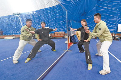 “第一堂课,先给学员讲抱拳礼。”张永生解释,武术比赛开始前和结束后,都会行抱拳礼。左手伸掌在上,右手握拳在下,两手相碰推至胸前。“掌为文,代表和平,拇指内扣意指谦逊;拳为武,代表斗争,这是止戈为武、点到为止的哲学。”形意结合,是中华武术的特色。张永生介绍,“打虎式”格挡动作在前,“弓步顶肘”在后,这一动作顺序,诠释着宽以待人、先防后攻、刚柔相济的处世准则。