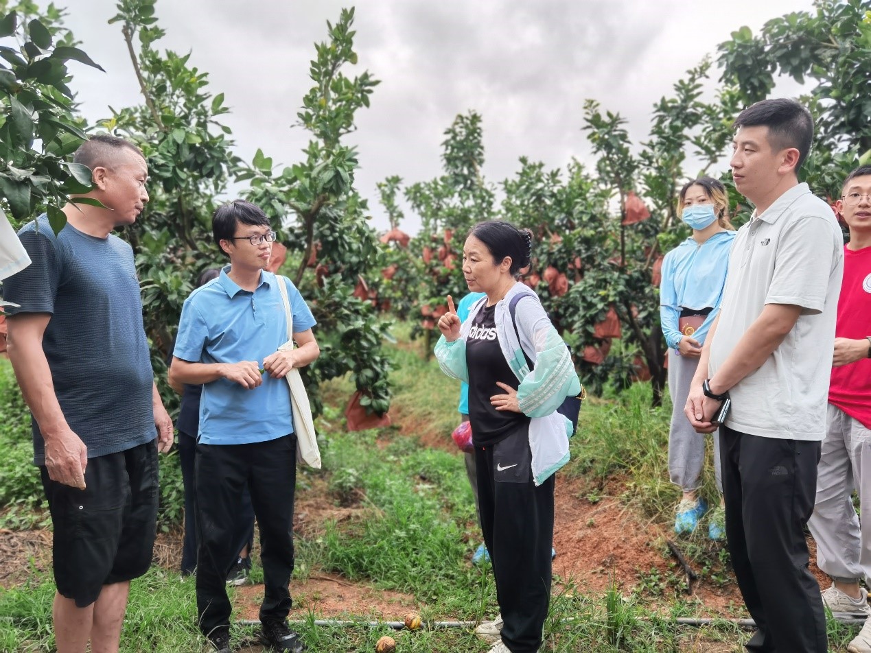 廖红(左三)讲解柚子种植的要点。受访者供图
