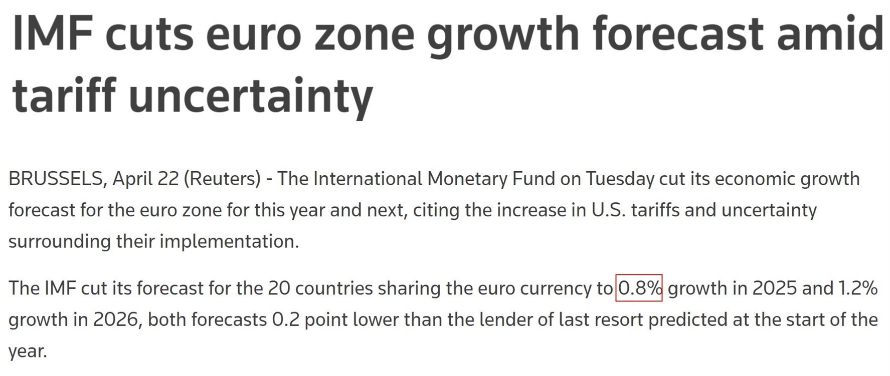 根据国际货币基金组织22日发布的最新一期《世界经济展望报告》,受美国关税措施冲击和政策不确定性的影响,今年欧元区经济增长率预计将比之前下调0.2个百分点至0.8%。