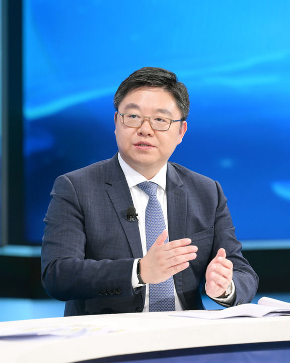 中国国际经济交流中心资深专家委员朱民在第十五期“中国经济圆桌会”录制现场发言。新华社记者 李贺 摄