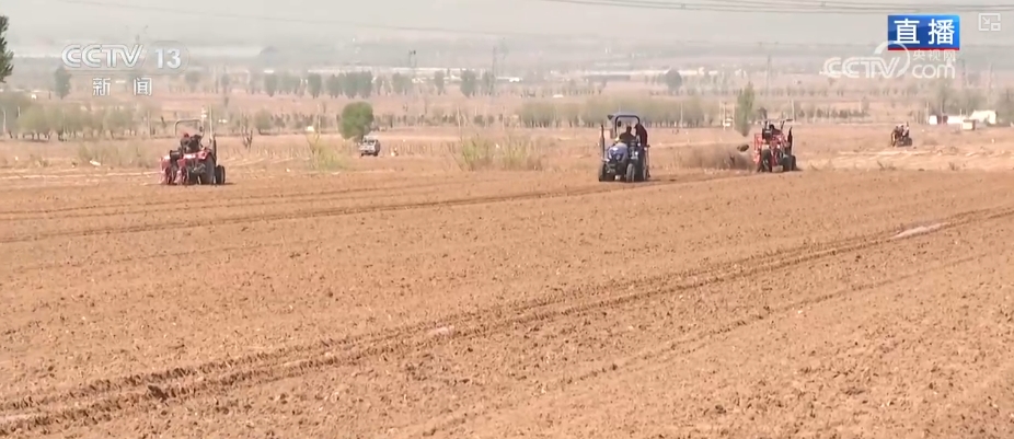 在山西朔州山阴县黄花梁富硒谷子种植基地,农机手正驾驶着不同功能的农机设备,在田间地头开展翻地、覆膜、铺设滴灌带、播种等一系列的作业。