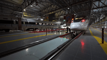 动车进入检修库内,工作人员正根据任务计划进行动车组一级修作业。
