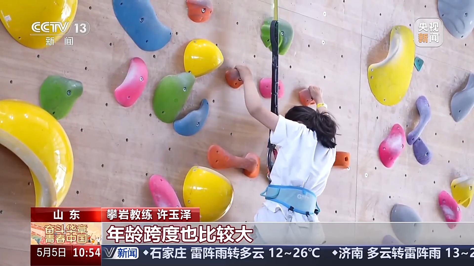 攀岩教练 许玉泽:假期的客流量上升比较明显,年龄跨度挺大,愿意来尝试这项运动的人越来越多。