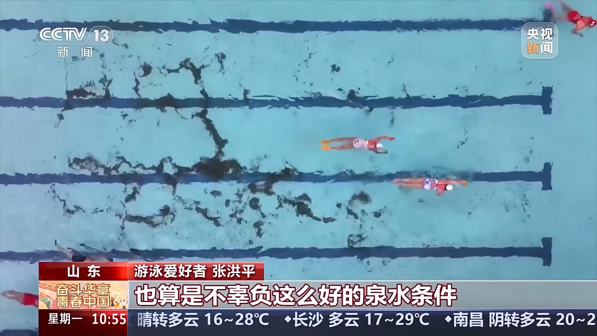 游泳爱好者 张洪平:我们泉城济南有泉水浴场,我们都是从年轻的时候就在这里畅游。设施条件是越来越好,多出来锻炼,也算是不辜负这么好的泉水条件。