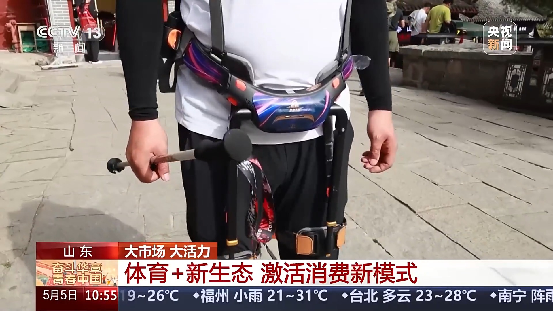 与此同时,体育正在和文旅深度融合,打开更大市场。这个“五一”假期,爬山变得更省力了。在泰山,不少游客都穿上了“登山助力机器人”,不到2公斤重,可以在登山时提供向上的助力,节省30%到50%的体力。