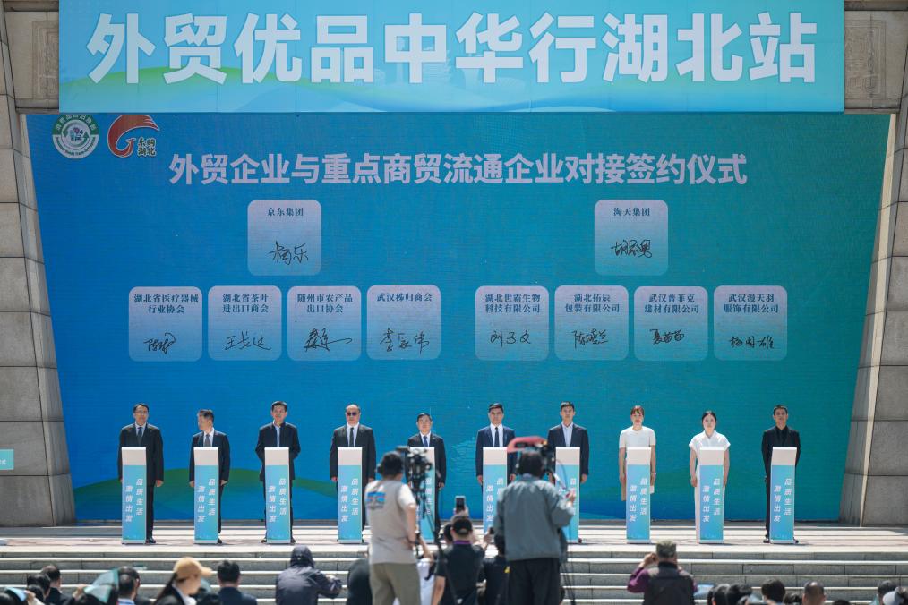 4月26日在启动仪式现场拍摄的外贸企业与重点商贸流通企业对接签约仪式。当日,外贸优品中华行湖北站暨“乐购湖北”消费季活动在武汉市汉口北国际贸易城启动。新华社记者 伍志尊 摄