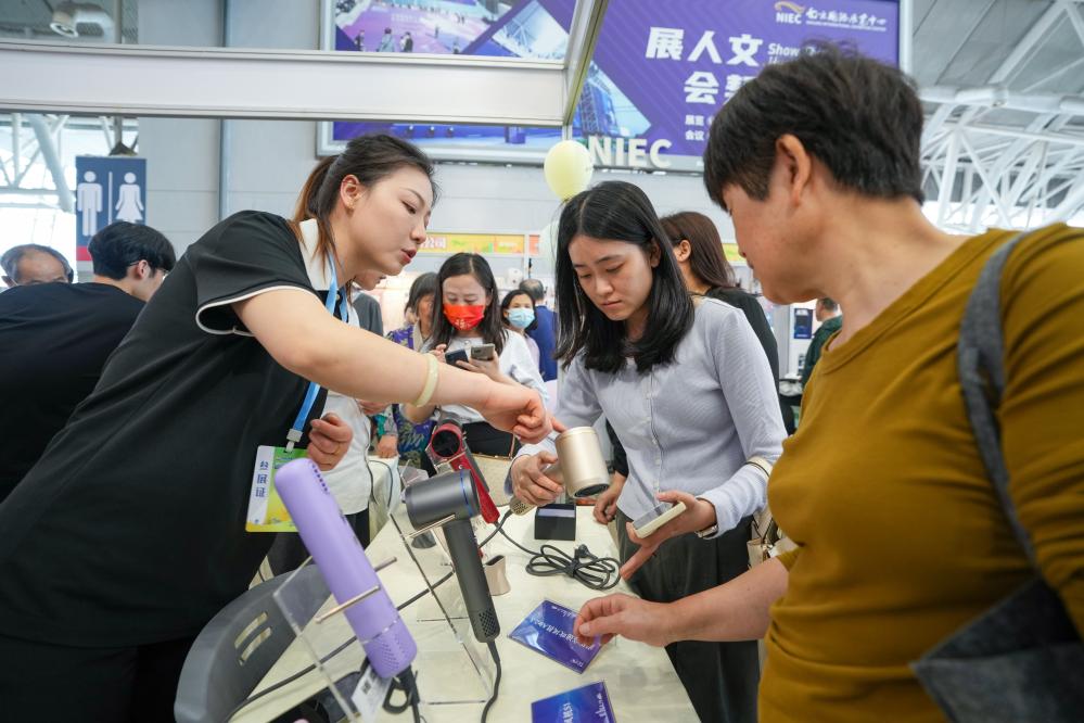 4月19日,工作人员在活动现场介绍吹风机产品。当日,2025年“外贸优品中华行江苏站”首场活动在江苏南京国际展览中心举行。新华社记者 李博 摄