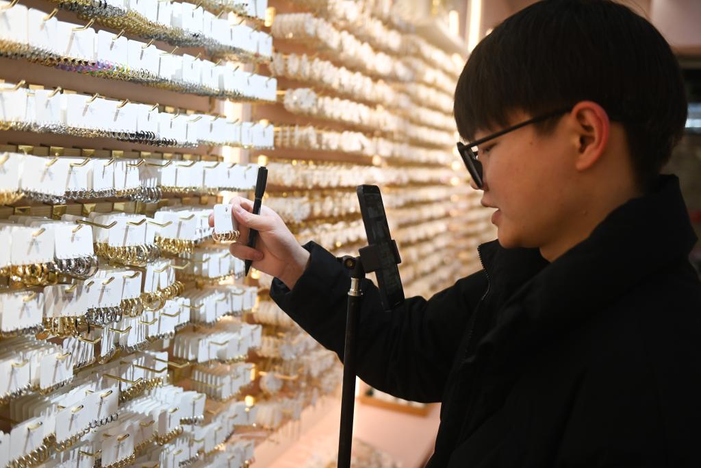 2月9日,义乌国际商贸城的一家饰品店铺工作人员通过手机直播平台销售产品。新华社记者 黄宗治 摄