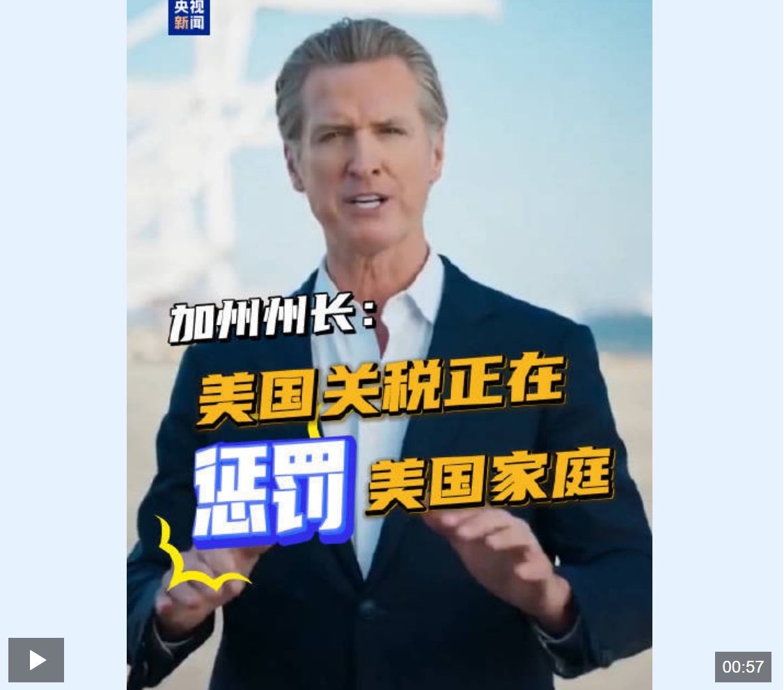 视频丨加州州长:美关税政策导致经济“亮红灯”