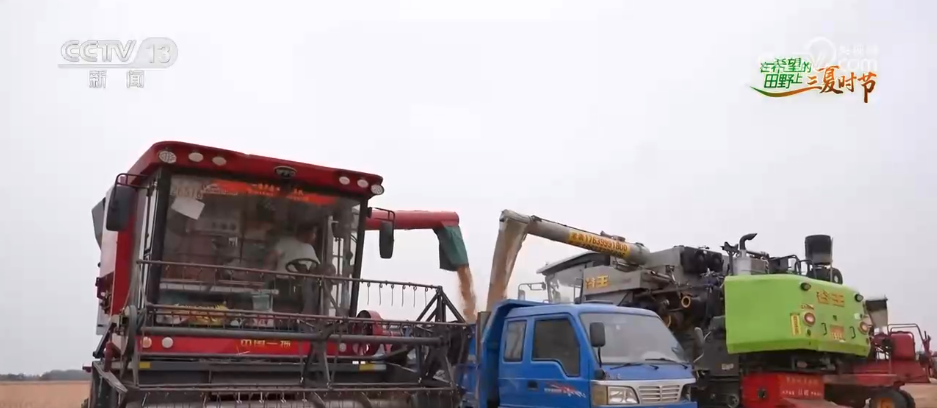 在河南南阳邓州构林镇这处麦田,金黄的麦浪层层铺开,麦穗 在阳光下熠熠生辉。4台联合收割机开足马力穿梭在麦田间,伴随着机器的轰鸣声,成熟的小麦被快速收割、脱粒,金黄的麦粒从收割机的出粮口倾泻而出,装入一旁的运输车辆。
