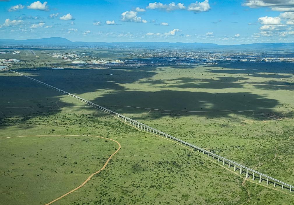 图为2025年5月16日,在肯尼亚内罗毕国家公园,一架飞机飞过穿越公园的内马铁路一期大桥上空。新华社记者李亚辉摄