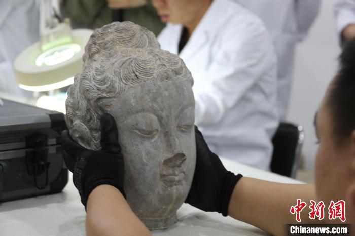 5月20日,河南洛阳,龙门石窟研究院工作人员展示已完成修复的唐代佛头。 中新社记者 阚力 摄