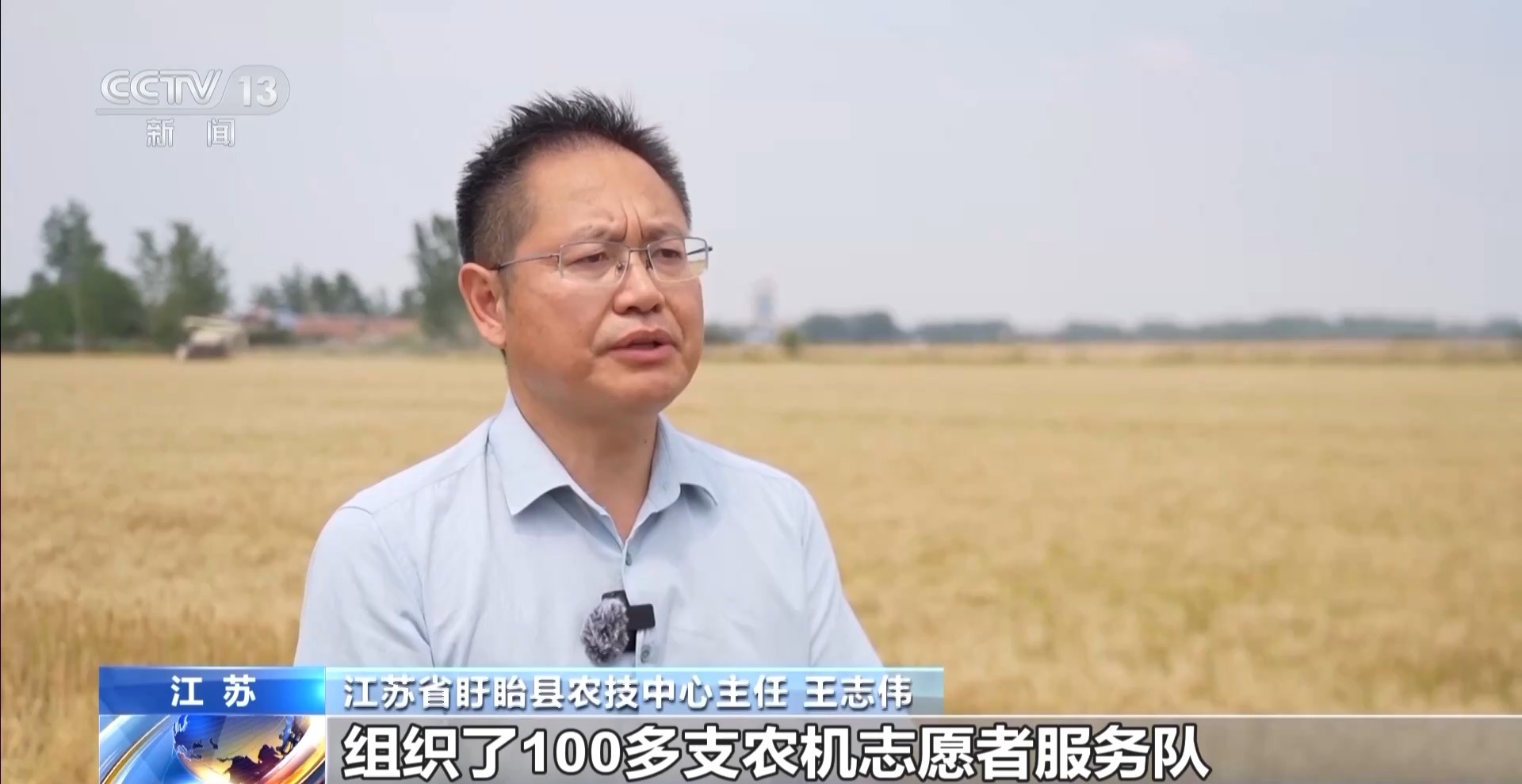 这几天,江苏3600多万亩小麦正陆续成熟。在最早收获的盱眙,气象预警显示,近期将有一次降雨过程,当地紧急调集5000多台联合收割机,争分夺秒抢抓晴好天气,计划在一周内完成全县90%以上小麦的抢收任务,确保颗粒归仓。