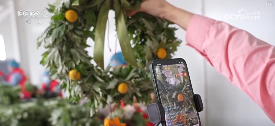 在江苏新沂的一家艾草企业直播间里,主播正热情地介绍新款艾草文创产品,线上订单源源不断。一旁的生产线上,工人们也正在熟练地制作艾草花环。端午临近,这款艾草花环日均销量突破万件。