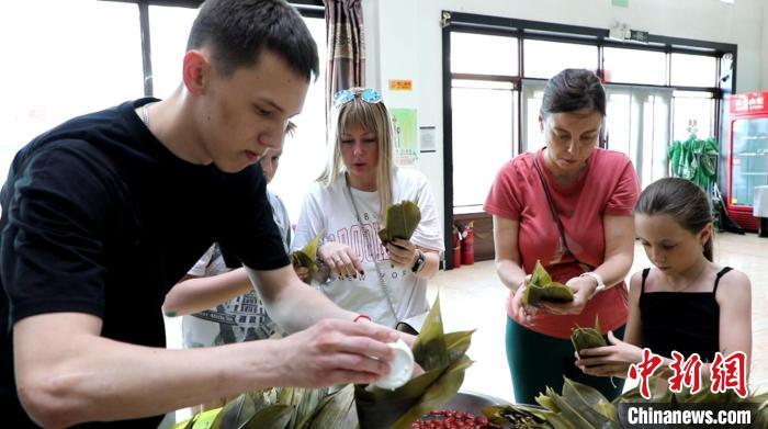 俄罗斯游客在双鸭山市饶河县学习包粽子。 饶河县融媒体中心供图