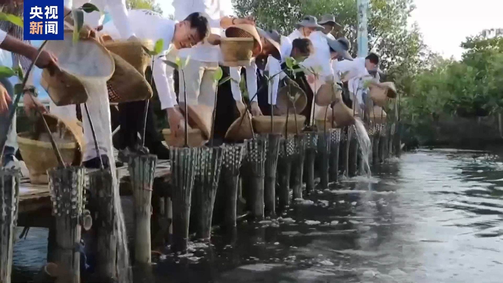 就在记者探访的当天,又一批红树苗被种入沿海滩涂。这样的生态投入也带来了民生收益,周边居民有了新的就业机会,渔业资源也逐渐恢复,越来越多珍稀野生动物在此安家。