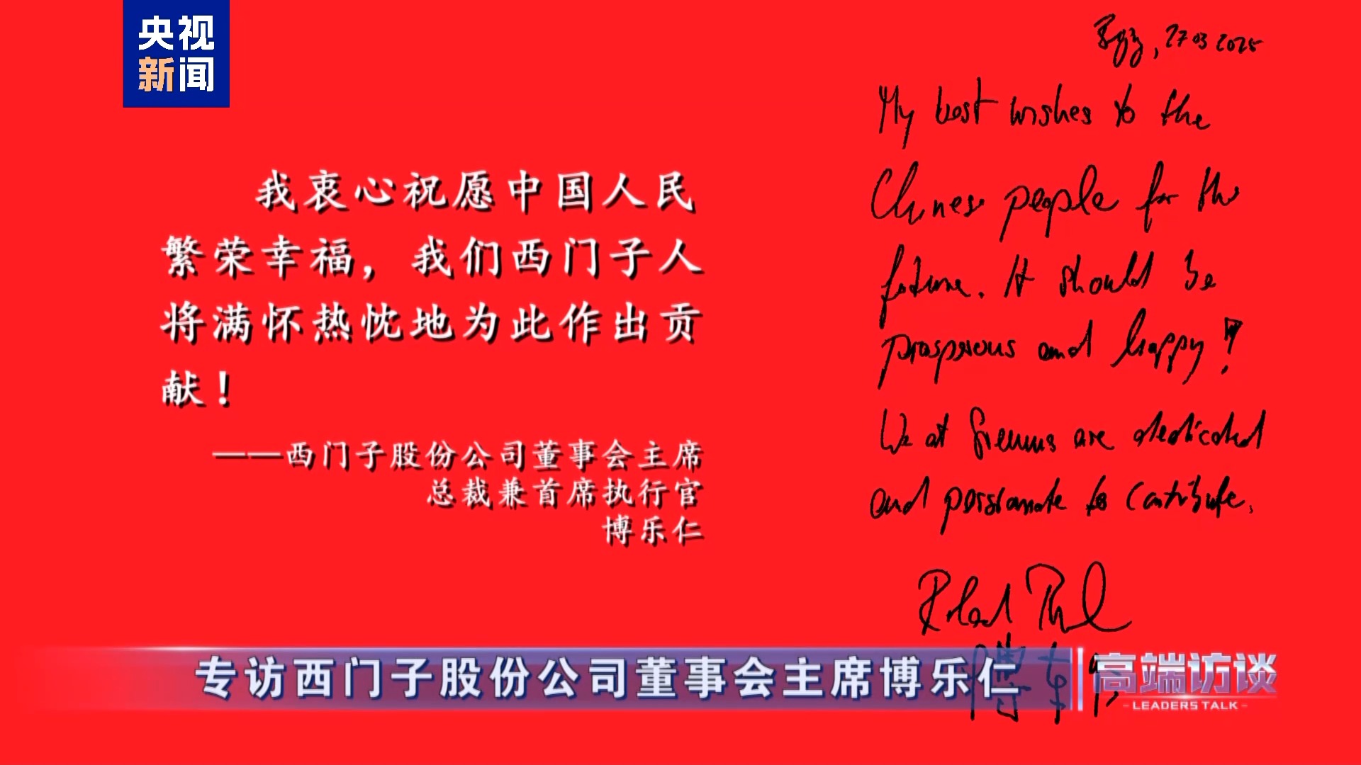 △西门子股份公司董事会主席总裁兼首席执行官博乐仁在接受总台专访后题词