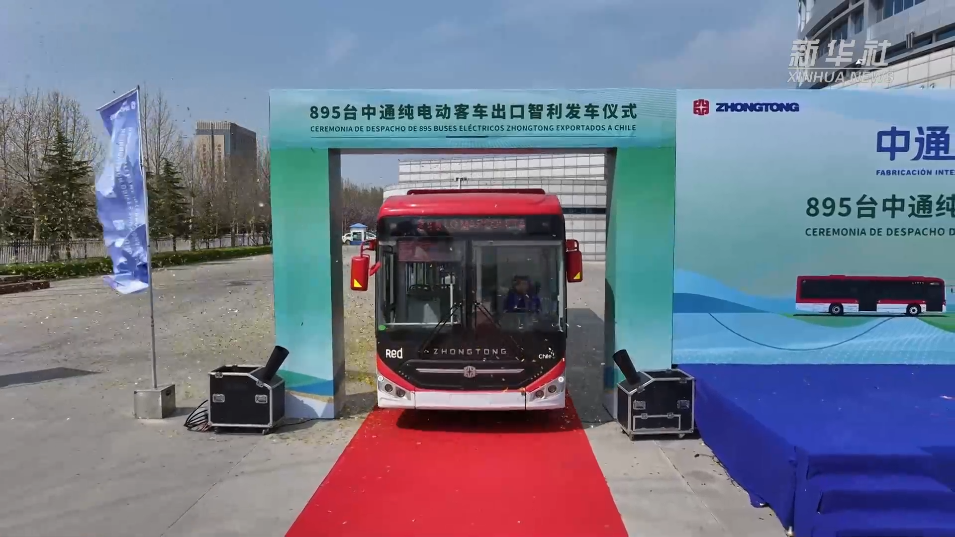 895台中通纯电动客车出口智利发车仪式。新华社记者 朱晓光 摄