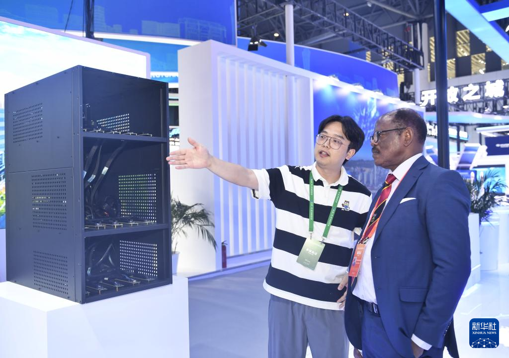 6月11日,参展商在向外宾介绍展出的高性能GPU服务器。