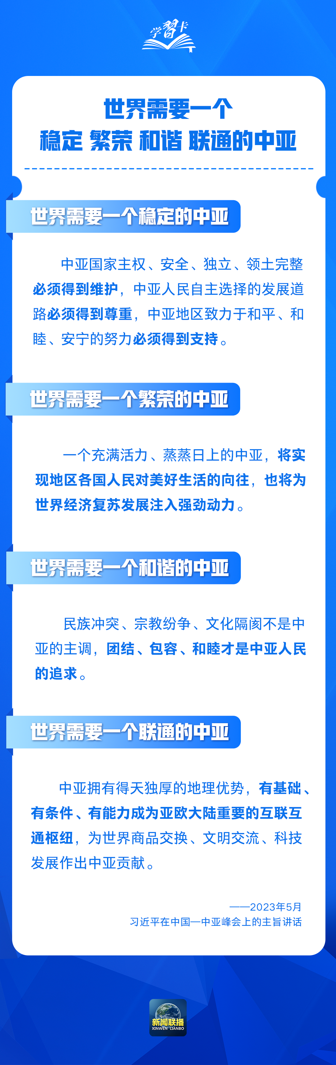 中亚是亚欧大陆的中心,处在联通东西、贯穿南北的十字路口。习近平主席强调,深化中国—中亚合作,是我们这代领导人着眼未来作出的战略抉择,顺应世界大势,符合人民期盼。