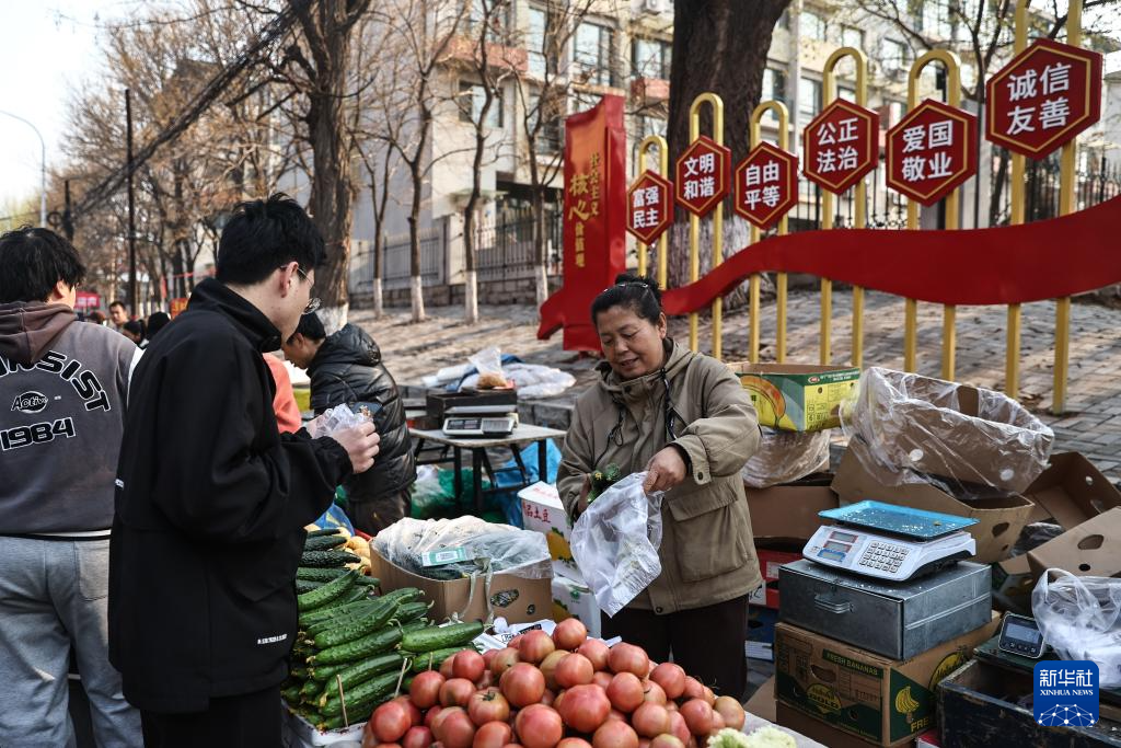 一名摊主在辽宁省锦州市石桥子早市售卖蔬菜(2025年4月15日摄)。新华社记者 潘昱龙 摄