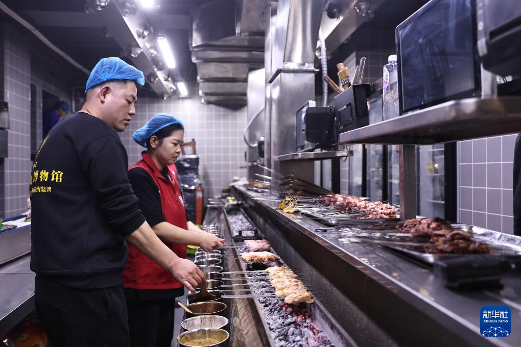 厨师在辽宁省锦州市一家烧烤店为食客烤制食材(2025年4月14日摄)。新华社记者 潘昱龙 摄
