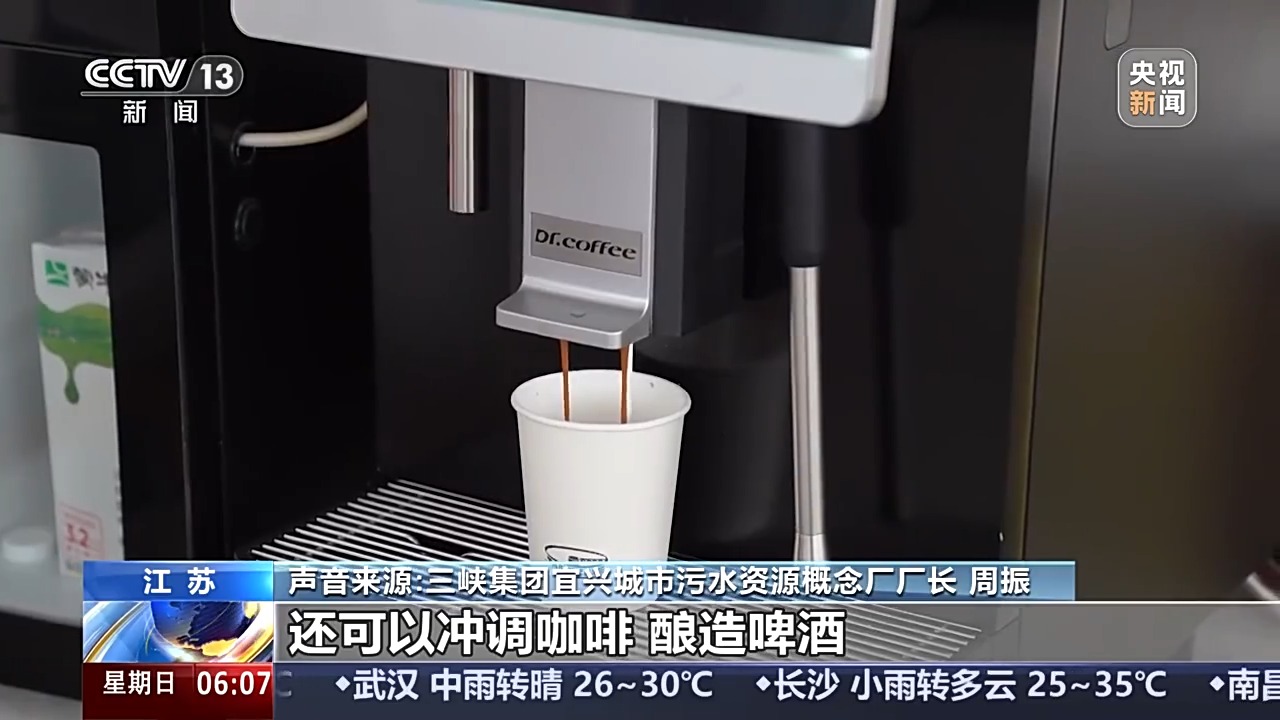 三峡集团宜兴城市污水资源概念厂厂长 周振:在这里,“污水”不仅可以直饮,还可以冲调咖啡、酿造啤酒,展示着未来污水利用的多重可能。