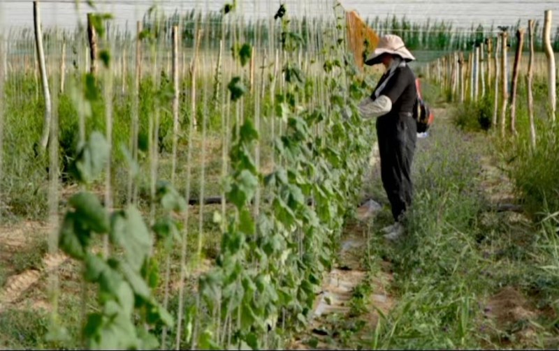 6月18日,在位于皮山县藏桂乡的新疆徽岳记生物科技有限公司瓜蒌种植基地,工人穿梭田间,开展整枝、抹杈、引蔓、上架等工作。石榴云/新疆日报记者 拍热扎提·阿不都 摄
