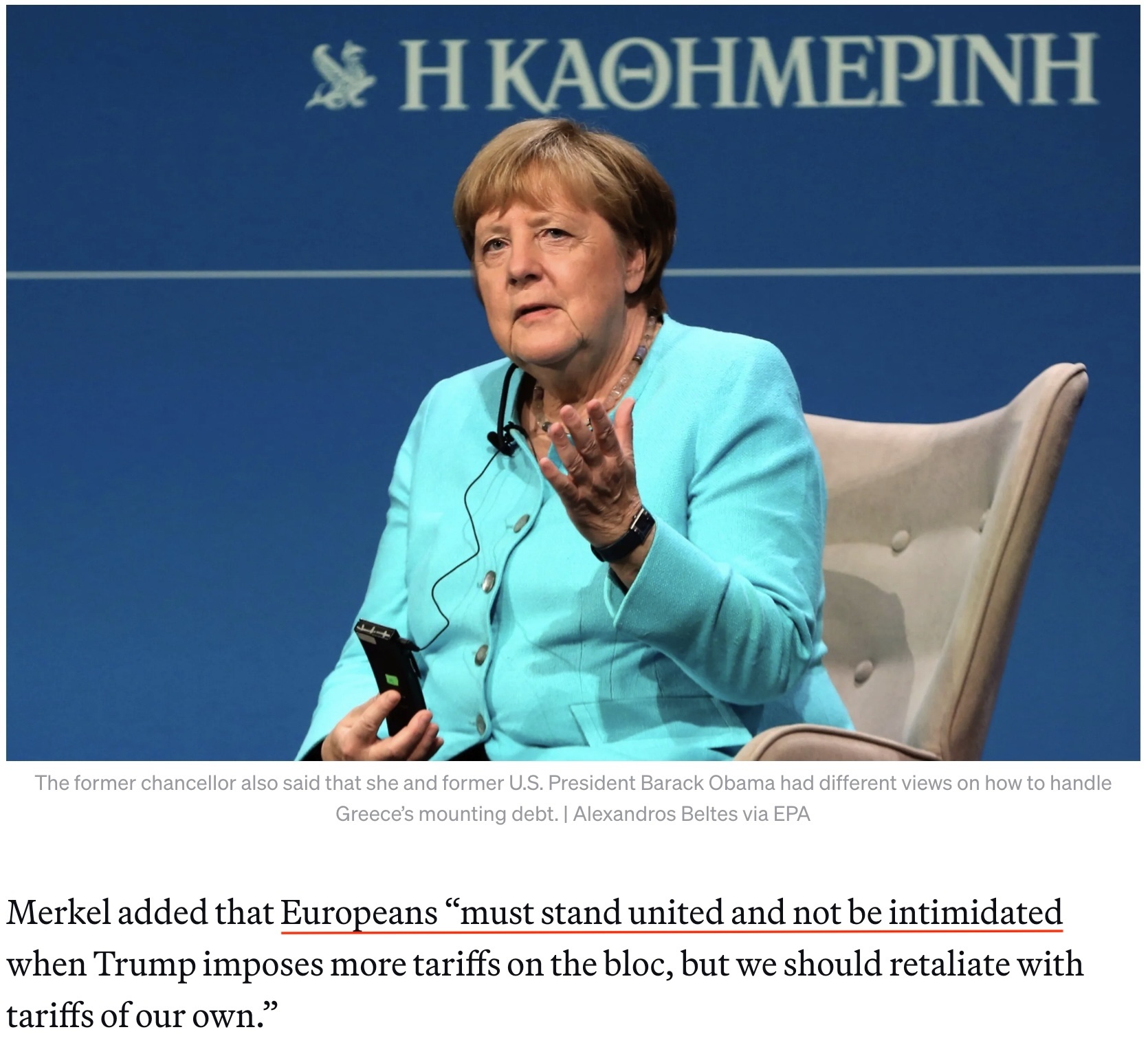 德国前总理默克尔2日在希腊雅典出席活动时强调,欧盟必须与美国通过谈判解决关税问题,为此欧盟必须团结一致,不应惧怕美国政府的关税,而应以自己的关税进行反击。