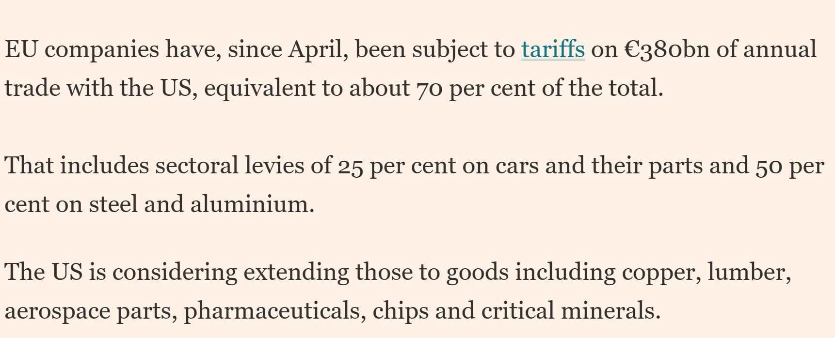 作为美国最大的贸易伙伴之一,欧盟目前被美方加征的关税除了“对等关税”缓征期间10%的“基准关税”外,还有25%的汽车关税和50%的钢铝关税。目前美国对欧关税覆盖了3800亿欧元的商品,约占欧盟对美出口的70%。同时,美国正考虑将对欧盟关税进一步扩大到木材、航空零部件、药品、芯片和关键矿产等领域。