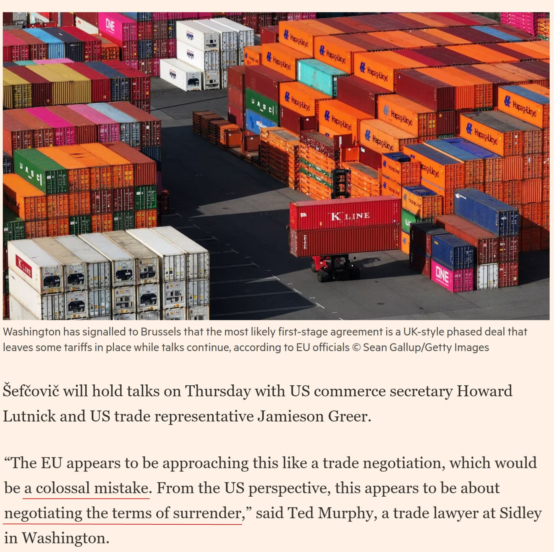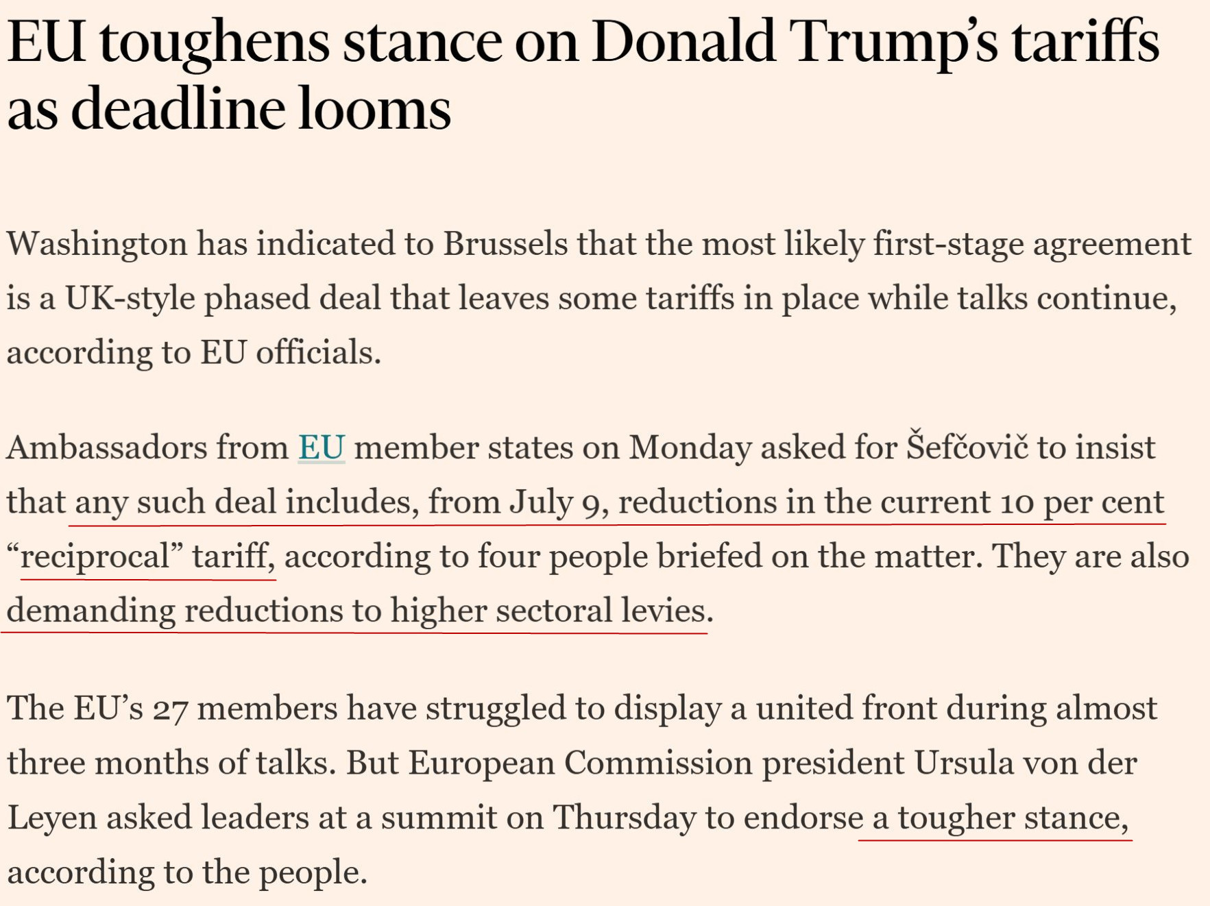 随着7月9日最后期限临近,欧盟成员国政府对美谈判立场趋于强硬,已要求赴美的谢夫乔维奇采取更强硬立场,主张任何协议都必须包括从7月9日起降低目前美国对大部分欧盟出口商品征收的10%基准关税,同时要求降低较高的(钢铝、汽车等)行业关税。