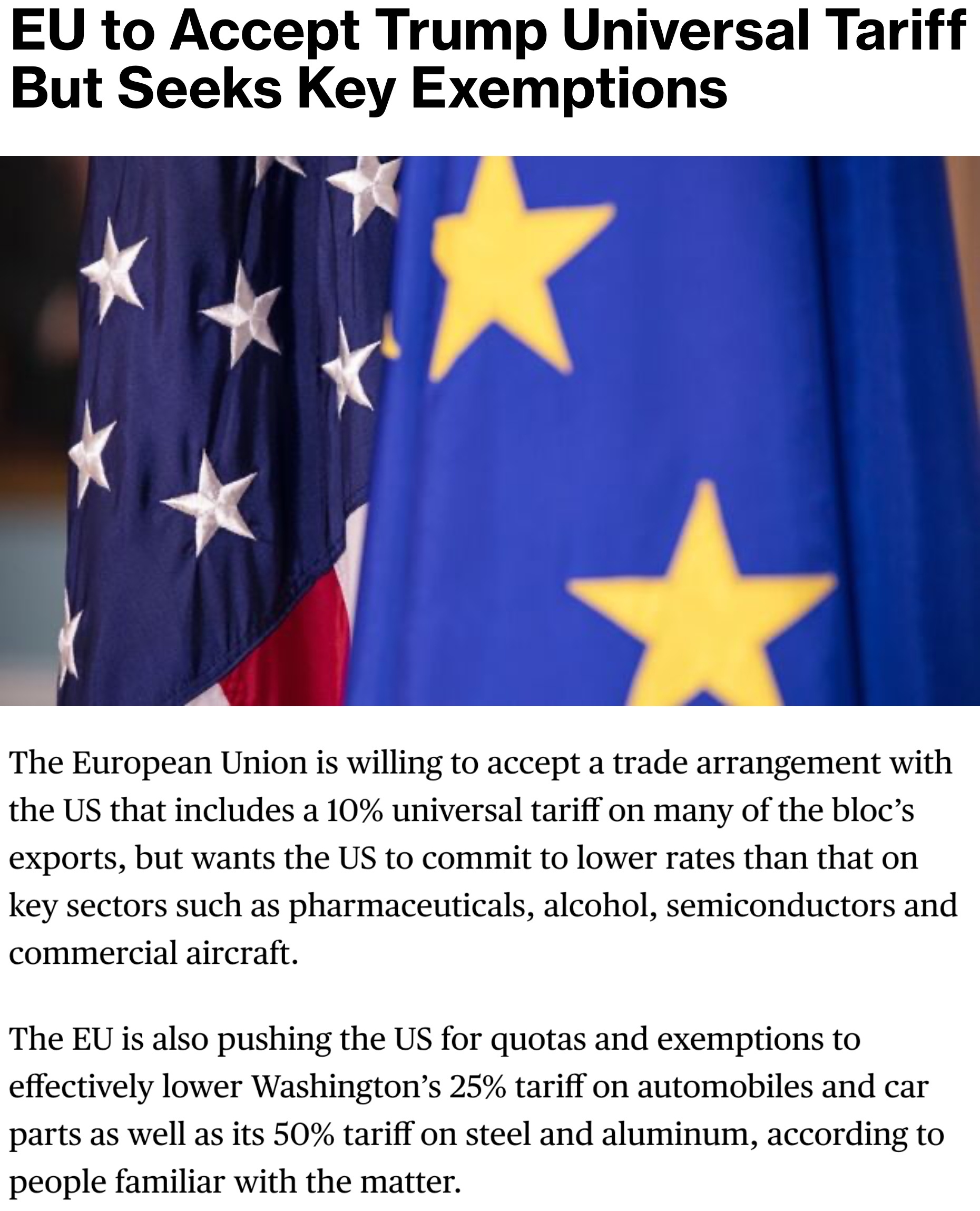 据知情人士透露,为了尽快解决问题,欧盟愿意与美国达成一项“略微有利于美国”的贸易安排,接受美方对大部分欧盟出口商品征收10%的统一关税,但希望美方在制药、酒精、半导体和商用飞机等关键领域实行较低税率。