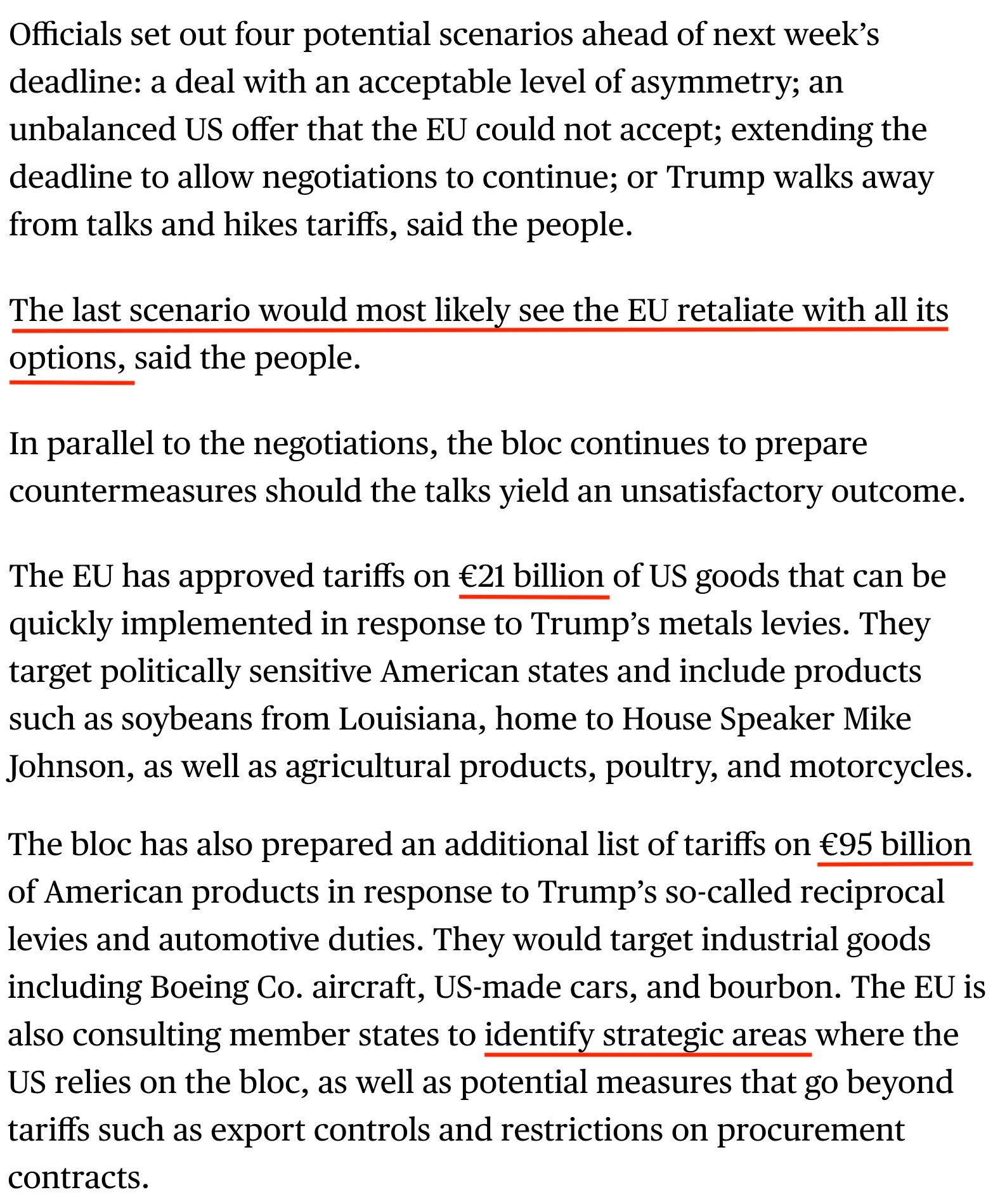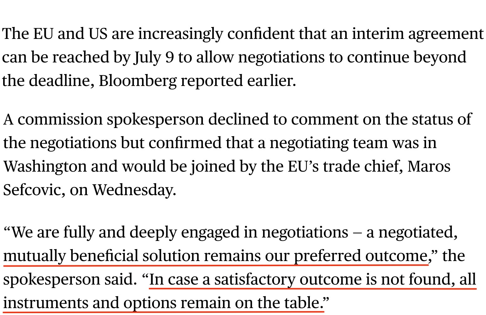 彭博社报道说,欧盟和美国都希望在7月9日之前达成一项临时协议,以允许谈判在最后期限之后继续进行,但欧盟也在准备应对对策。