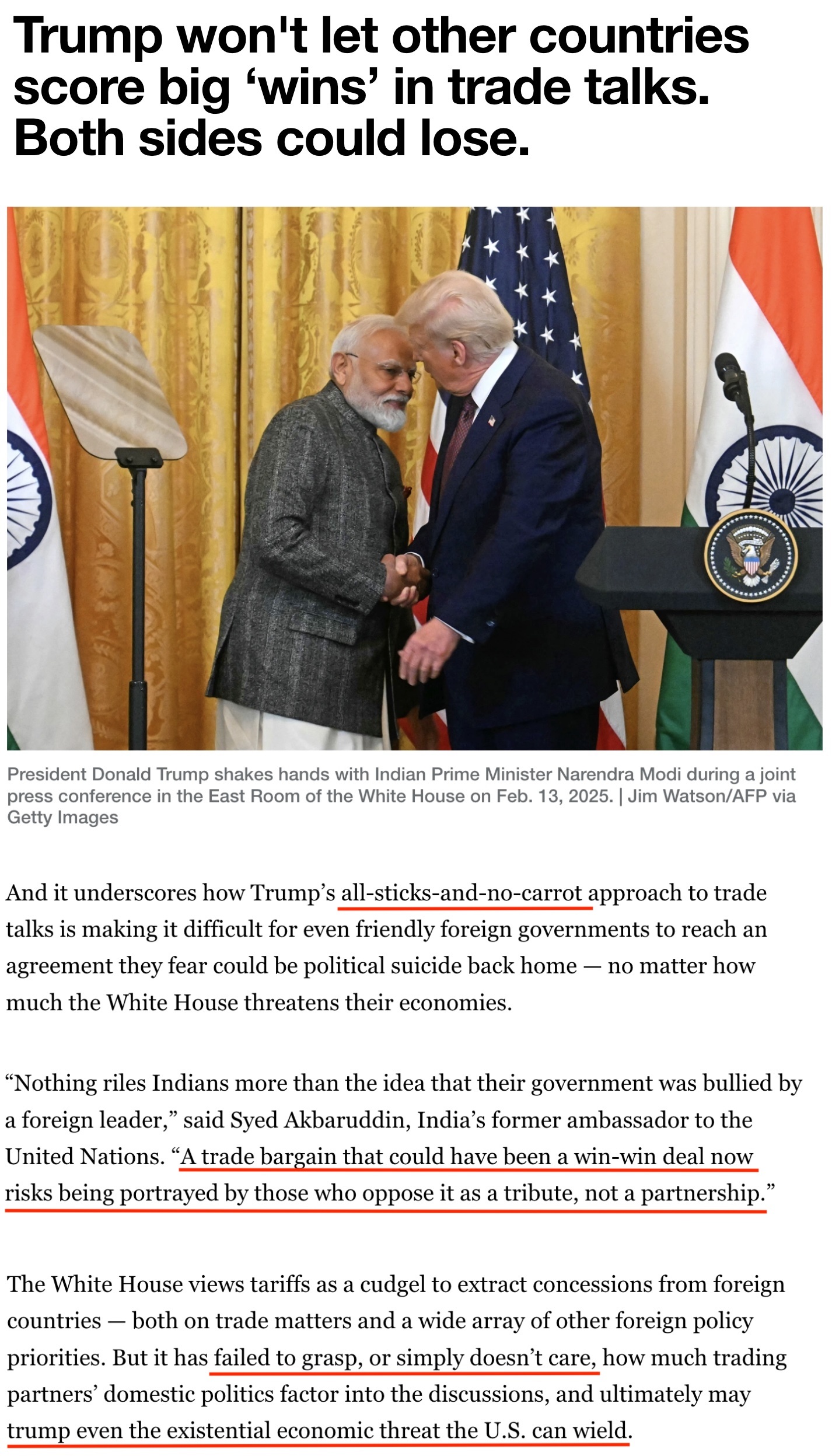《政治报》刊文指出,特朗普在贸易谈判中“只有大棒、没有胡萝卜”的策略让即使是友好的外国政府也难以达成协议。