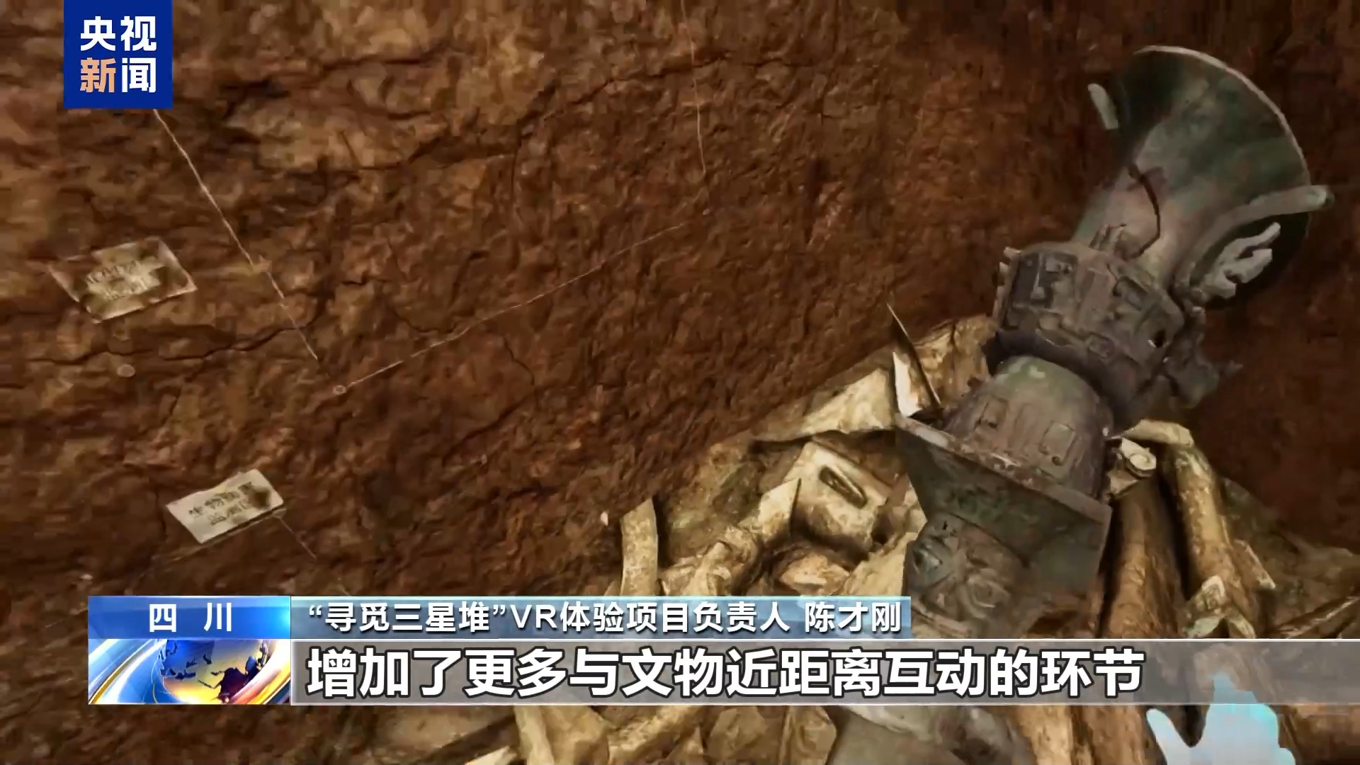 “寻觅三星堆”VR体验项目负责人 陈才刚:增加了更多与文物近距离互动的环节,让游客可以亲手“触摸”到文物,能够将文物从考古坑里“抱出来捧在手上”,大家感到特别新颖。