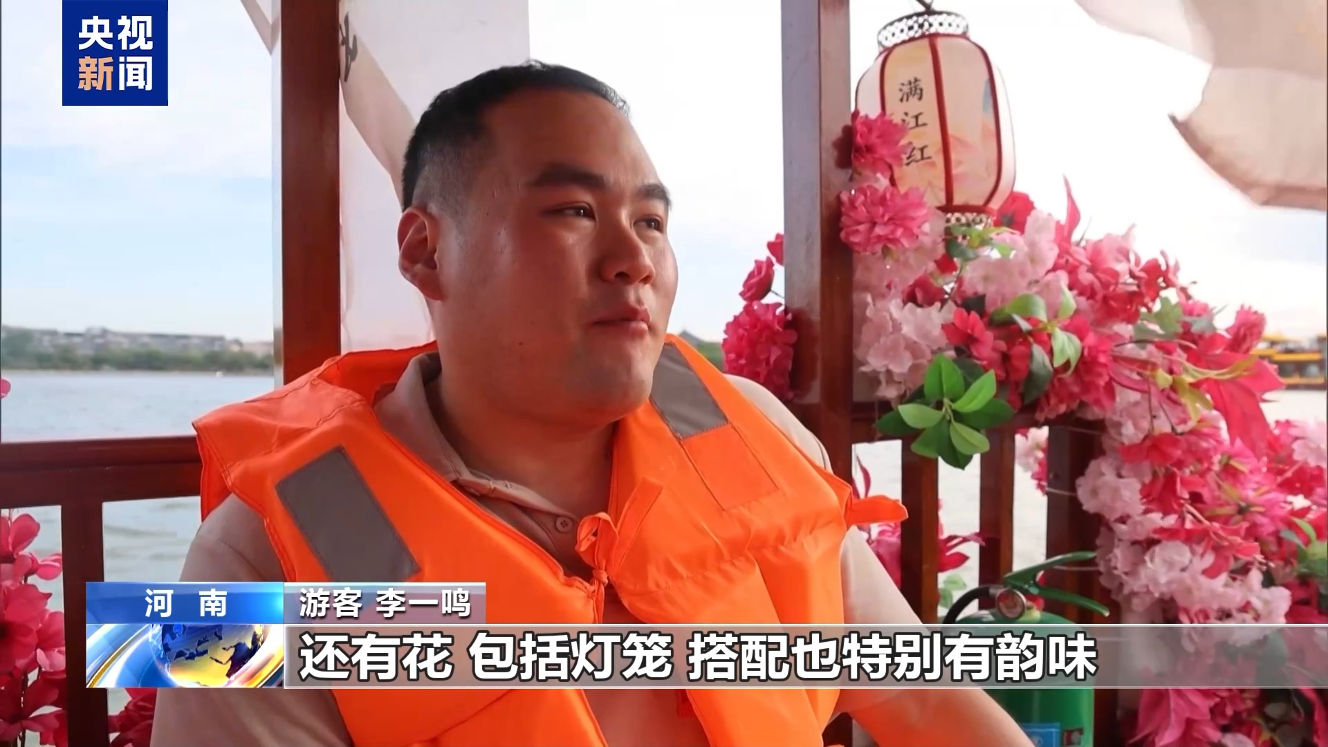 游客 李一鸣:置身于这个历史古城之中,就像《清明上河图》里面的人物一样。船上装点的古典诗词,还有花,包括灯笼,搭配特别有韵味。