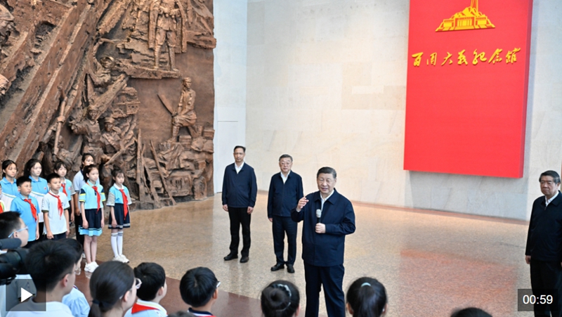 7日下午,习近平总书记来到山西省阳泉市,向百团大战烈士敬献花篮,参观百团大战纪念馆。在纪念馆大厅,习近平同青少年学生和纪念馆工作人员亲切交流。他对大家说,今天来到这里有特殊意义。七七事变是全民族抗战的开始,中国共产党是全民族抗战的中流砥柱,百团大战让全世界看到了中国共产党和中国人民抗战的意志和力量。我们坚持14年抗战,作出了巨大牺牲。前事不忘,后事之师。孩子们要争做民族的脊梁,一定要把我们国家建得强盛起来,要为全世界的和平作贡献。希望寄托在你们身上,未来是属于你们的。希望你们好好努力、奋发图强,做一个堂堂正正、光荣自豪的中国人。