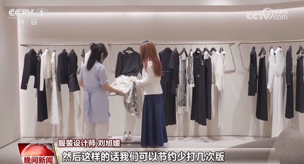 服装设计师刘旭媛称:“假设说我想做这条连衣裙印花的,把这块面料、这块花型拍上去,AI生成穿在这个白胚上面,然后来呈现一条真实连衣裙的效果。用AI多次修改之后,最后服装呈现出来会非常满意。这样我们可以节约少打几次版,可以节约很多的开发费用。”