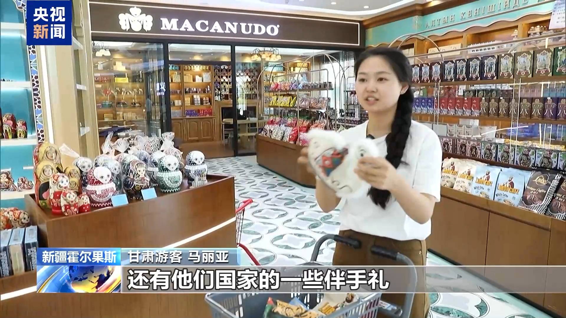 甘肃游客 马丽亚:我一进到合作区的免税店就选了好多吃的,像哈萨克斯坦的巧克力,还有他们国家的一些伴手礼,可以送给朋友,还有咖啡、各种食品。