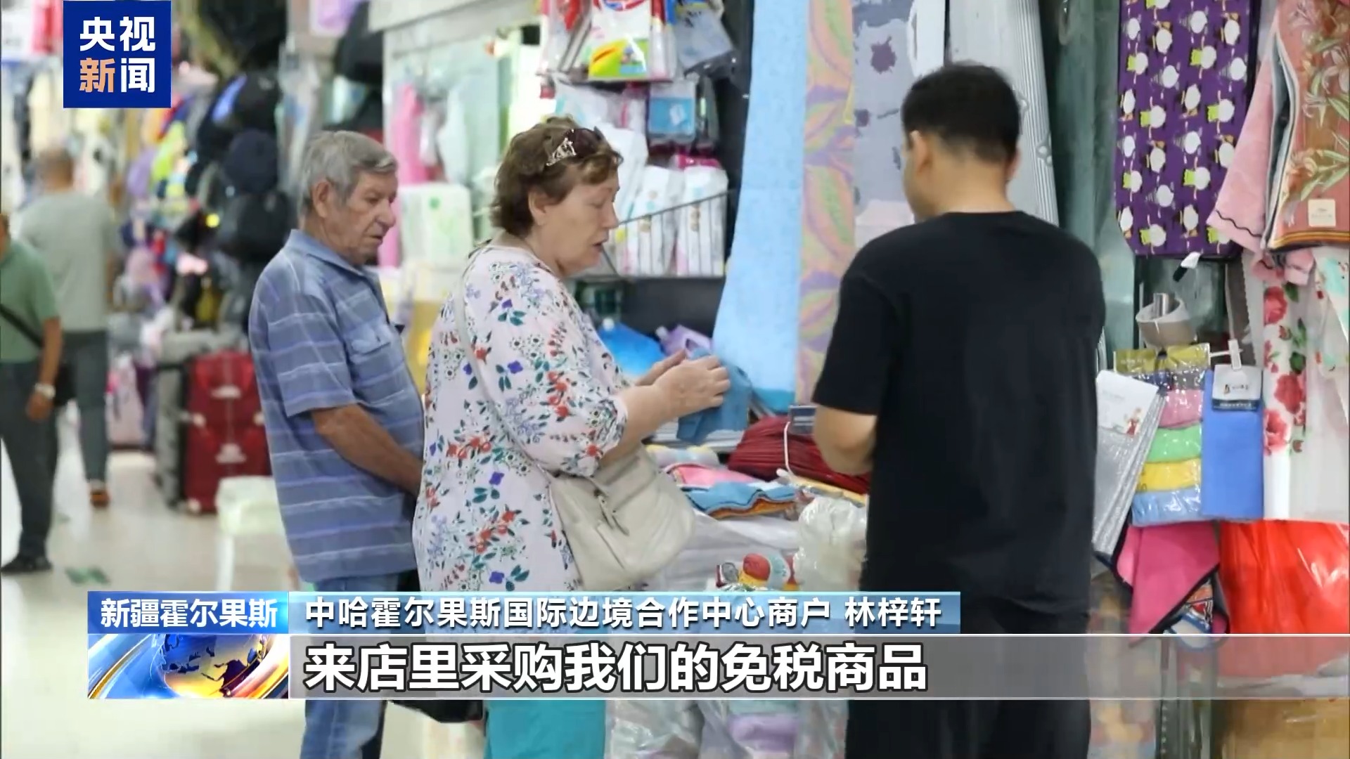 中哈霍尔果斯国际边境合作中心商户 林梓轩:现在是旅游旺季,每天有大量的国内外游客来店里采购我们的免税商品。我们店单日营业额最高一天可达10万元。