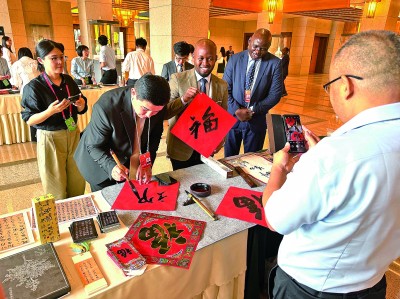 与会外国嘉宾在会议间隙体验写福字。光明日报记者 杨逸夫摄/光明图片
